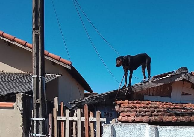 No telhado da residência, um dos filhotes estava amarrado pelo pescoço com uma corda e, após se enroscar, ficou pendurado perigosamente próximo aos fios de energia elétrica. A situação representava risco de eletrocussão e estrangulamento para o animal.