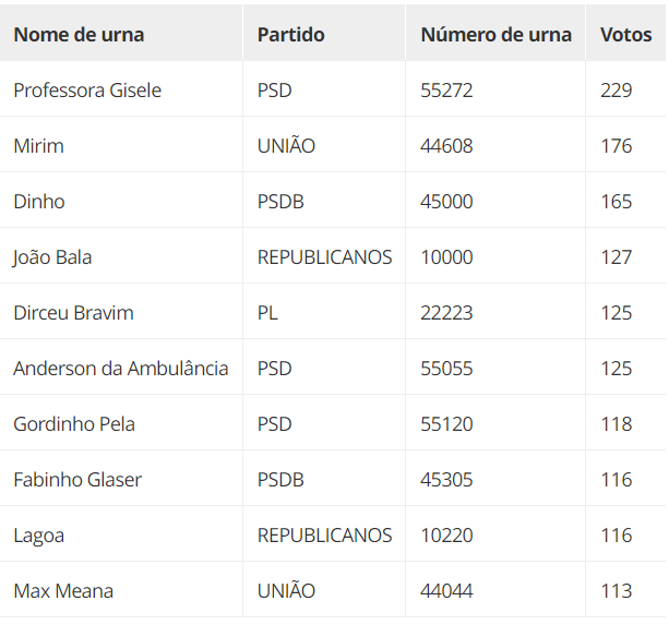 VEREADOR – Veja, abaixo, a lista dos 10 candidatos a vereador mais votados em Águas de Santa Bárbara nas eleições 2024.